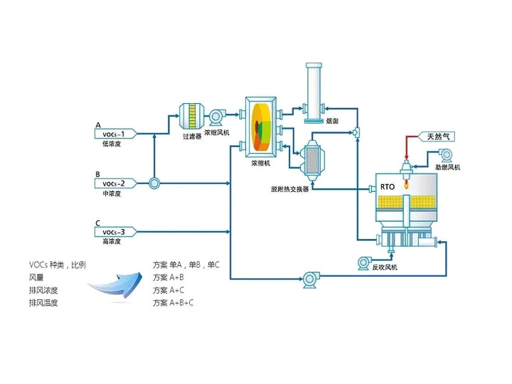 工厂所排放出VOCS废气进入系统后,第一阶段系经过疏水性沸石转轮,VOCS 污染物质首先于转轮上进行吸附;第二阶段脱附程序是把部分沸石转轮排放气与RTO/RCO反应器燃烧室热气进行热交换后加热为热气(约 150 至180 ℃),使其通入转轮内利用高温将有机物脱附下来,此时脱附废气中的VOCs浓度^高可控制为入流废气40倍左右,而脱附下来的高浓废气进入RTO/RCO中燃烧,不需要添加助燃气体,依靠本身的热值维持燃烧,^终达标高空排放。